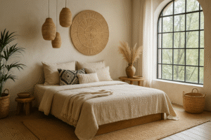 A sun-drenched sanctuary inspired by global textures and calming minimalism. This airy, artfully styled room blends woven décor, natural woods, and handcrafted accents with clean lines and open space. Tall arched windows let in soft light and leafy views, creating a peaceful atmosphere that feels both rooted and expansive.