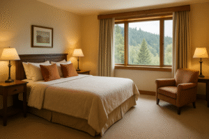 Wake up to the gentle rustle of leaves and sweeping views of evergreen treetops. The Woodland Retreat offers classic comfort with earthy tones, soft lighting, and large windows that frame the serene beauty of the forest. Sink into a plush queen bed, enjoy your morning coffee from the cozy armchair, and let nature ease you into a slower pace.
